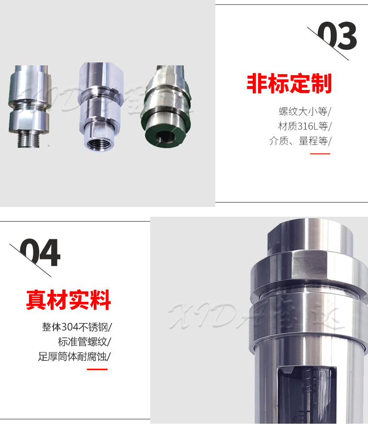 3. 外形:璽達儀表采用整體304不銹鋼,標準螺紋,適用水,氣等設備,真材實料,足厚足料。