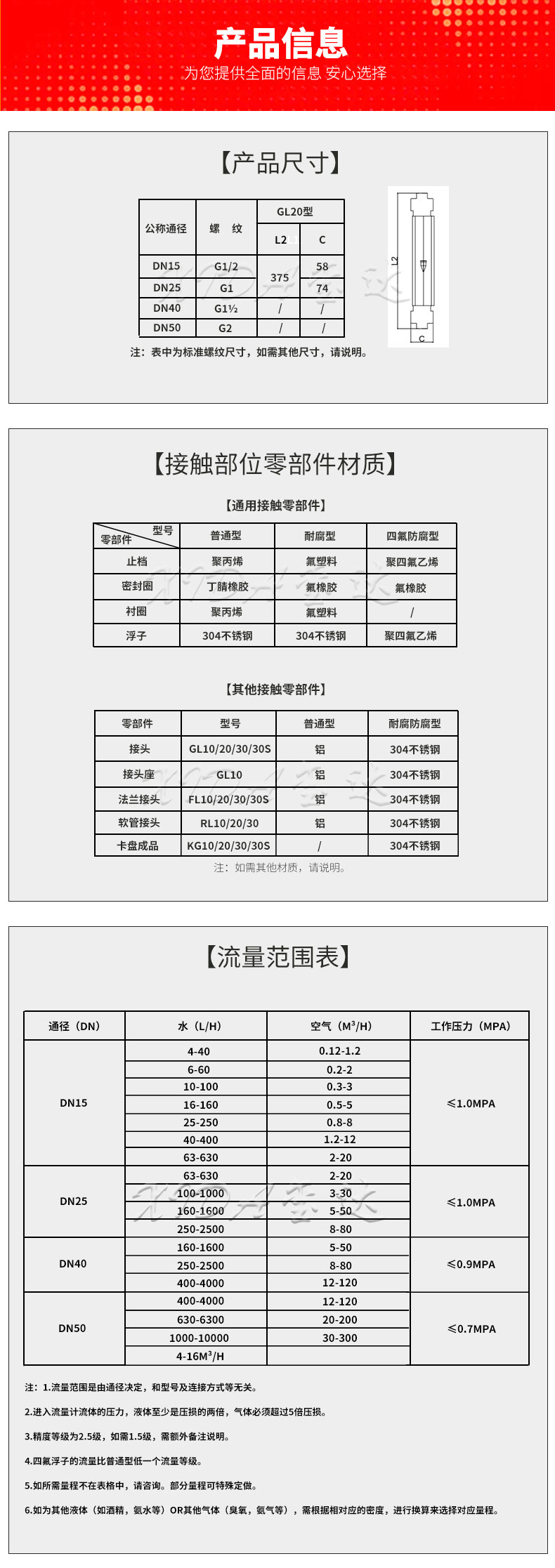 2.性能:GL20-25F玻璃轉子流量計采用G1管螺紋,工作壓力可達1.0MPa,螺紋連接,接液部位不銹鋼。